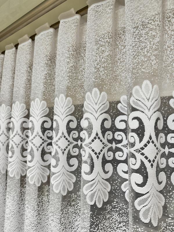 Красива тюль на кухню або веранду. Сшита из качественного турецкого жаккарда. Тюль фабричного качества, долговечная, пропускает воздух, легко стирается и практически не требует глажки. Ширина 3 м. Подойдет для карниза шириной до 2 м. Высота: 1.15 см Крепление: фабричные отверстия для трубы или струны. Тюль полностью готова к использованию - можно сразу вешать на окно.