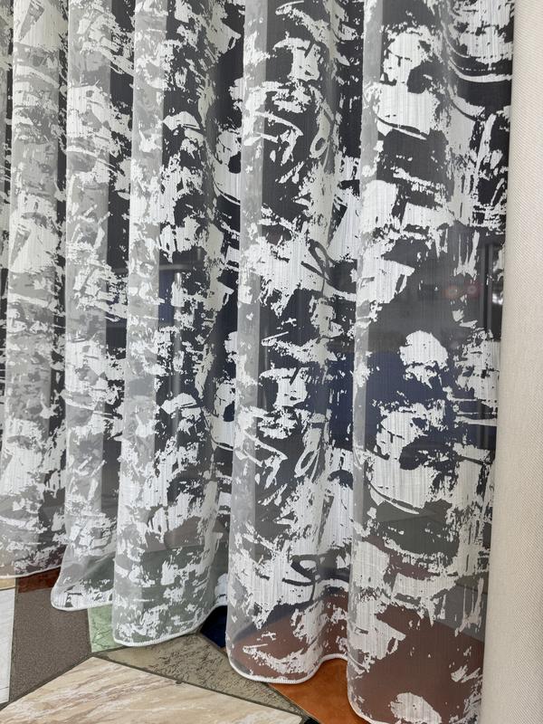 В наличии 1.95 м, 3.1 м, 3.85 и 4.4 м тюля. Стильный тюль с абстрактной печатью в технике Деворе. Основа -- органза премиум качества с добавлением вискозы. Ткань мягкая, приятная на ощупь и практична в использовании: долго служит, легко стирается и практически не требует утюжки. Высота 2.95 м. Ткань набирается по ширине окна, в зависимости от размера карниза. Производство Турция.
