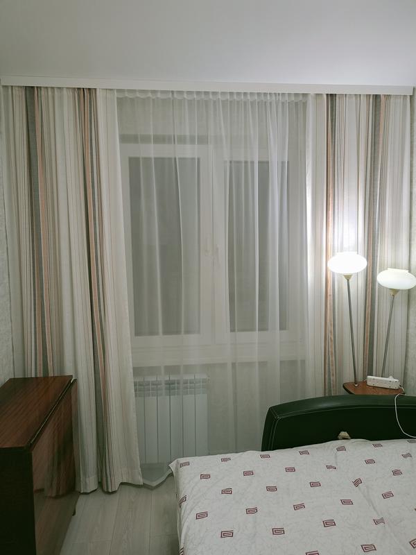 Шторы из льна, в полоску. Пошиты, с тесьмой. Основной цвет молочный. В хорошем состоянии. Размеры каждой шторы: высота 2,38м (при необходимости возможно удлинить до 7 см), ширина 1,42 м.