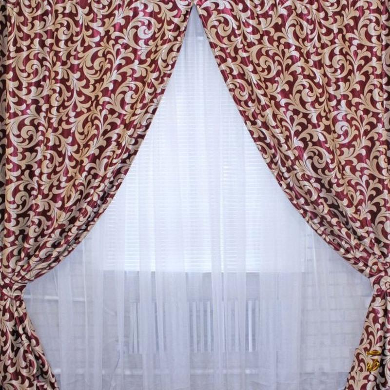 Комплект штор состоит из двух полотен шириной 150 см. каждая. В наличии комплекты с шириной полотен 200 см, 250 см, 300 см., а также ткань на метраж. Светонепроницаемость – главная характеристика ткани блэкаут. Благодаря специальной технологии переплетения волокон достигается потрясающий эффект – темнота в комнате даже в самый ясный день. Состав ткани - полиэстер. Ткань - блэкаут. Высота штор - до 280 см. Цвет - бежевая основа и бордовый рисунок. Цена - за комплект из двух штор шириной 150 см каждая. Возможен пошив по вашим размерам. Цвет штор может немного отличаться, в зависимости от настроек вашего монитора. полное описание.