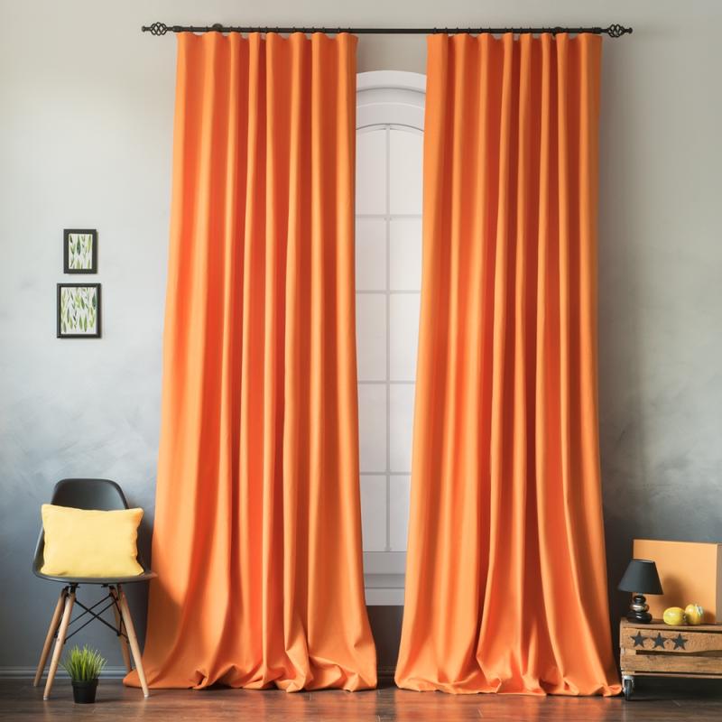 Оранжевые шторы. Полиэстер ( не электризуется) Ширина 1,45 Высота от 1,8 до 4 Цена указана за 1 штору (1,45*1,8) Шторы идут на хб тесьме для крючков. Ширина тесьмы в 2-х размерах