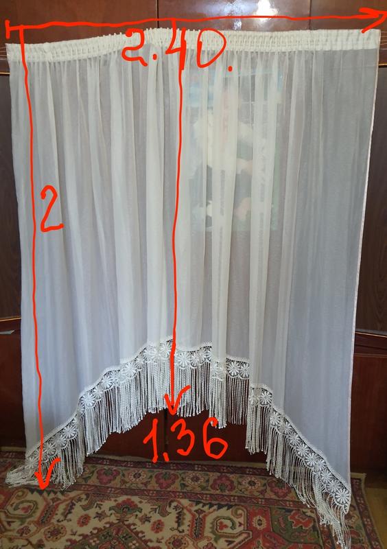 Кухонная тюль б/у но в идеальном состоянии.Максимальная длина сверху 2.40 но возможно подтянуть и сделать короче под Ваш карниз.Все размеры на фото.Колир теплый беж.Пересылка через кнопку купить укр почта и новая почта. С БЕЗОПАСНОЙ ОПЛАТОЙ НЕ РАБОТАЮ.Перед тем как нажать кнопку купить пожалуйста сперва напишите мне.