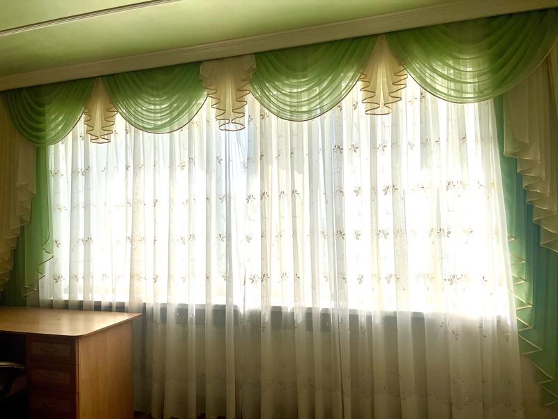 Красивый, нежный набор, с полоской для кружков: ламбрикен -мах. длина 2,58 м; длинна.верх 57 см; ширина 4,45 м. Тюль- две шт, сшитые сверху на одной полоске, то есть, тюль одна, а посередине разрез для удобства. Выс. 2,60 м; ширина полностью (2шт)- 9,3 м. Цена набора 2600 грн. 8-10 фото: Натуральная тюль с тесьмой-петлями и ламбрекеном снизу. 3.2 на 2,90 высота, цена -1200 грн. Шикарная натуральная тюль в идеальном состоянии с тесьмой-петлями и ламбрекеном снизу. Выс.2.80 и 10м (ширина). Цена-3500 грн