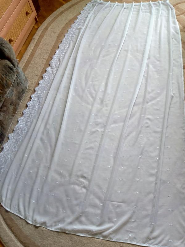 Нежная батитстовая белоснежная занавеска, высота 233 см, ширина низа 150 см, вшитый утяжелитель, ширина верха 90 см, заложенные складочки, есть крючки. Чистенькая, без пятен, но есть небольшие повреждения, зацепки (на фото). Смотрите другие Мои объявления.