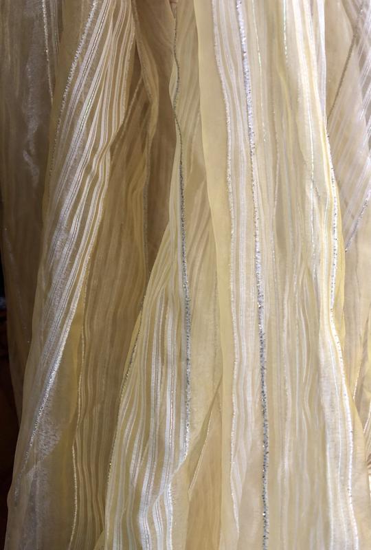 Желтая тюль( скорее органза) в полоску с люрексом, 3,12(высота)х6,15(длина по свободному краю) в метрах сверху пришито 10 см( для удлинения) лента тесьма для сборки, внизу обверлочена с небольшим утяжелителем) без характерного запаха, является змятость после стирки