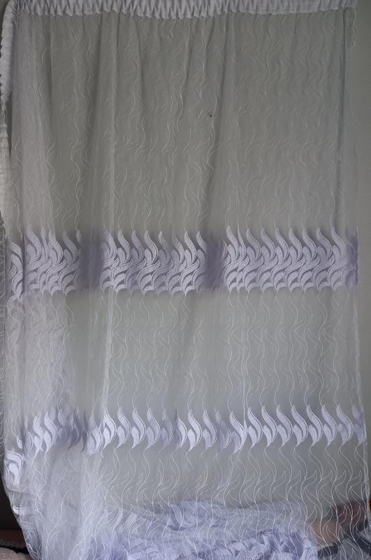 В идеальном состоянии, без дефектов. Белоснежный цвет с голубым оттенком, с вышивкой. Ширина 4 м Высота 222 см