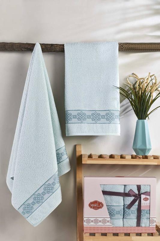 ▪️Код товара: Набор махровых полотенец Marla Материал: махра Состав: 100% хлопок Плотность: 450 г/м. кв Производитель: Турция Шикарный набор мягких пушистых полотенец может быть хорошим подарком на разные праздники. 🏷️В комплекте два полотенца: лицевое - 50х90 см и банное 70х140 см 🏷️Цена -800 грн
