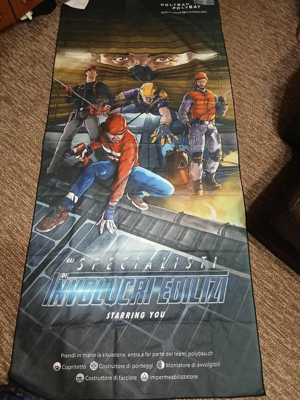 Полотенце из микрофибры, рекламирующее швейцарскую компанию polybau и ее профессии в сфере...