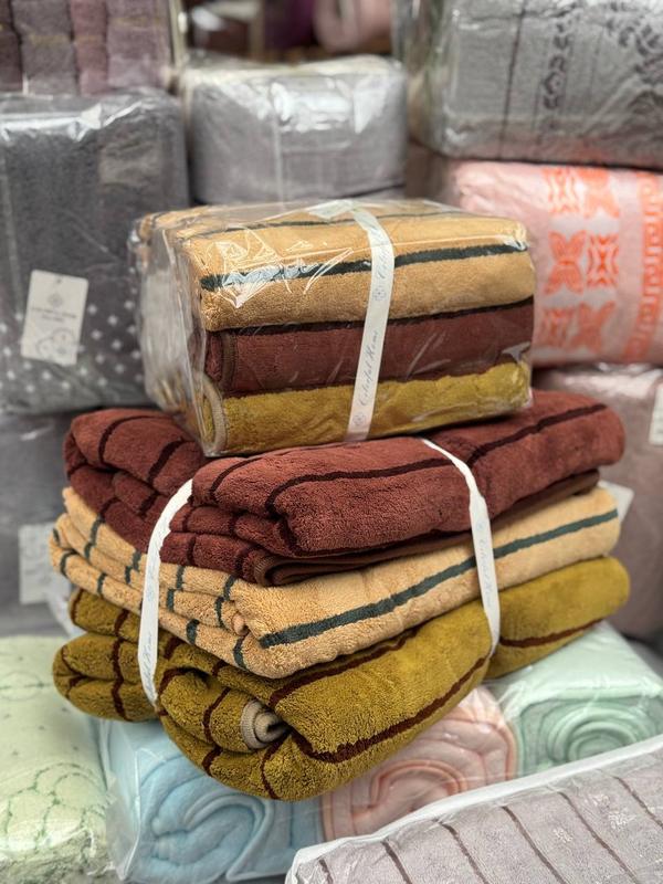 Полотенца Очень плотная и пушистая микрофибра 😍😍😍 ✅ Ткань: микрофибра Размеры: ✔️ Баня: 140/70 см В упаковці: 3 шт. 💰Цена за упаковку: 700 грн ✔️Лице : 100/50 см В упаковці: 3 шт. 💰Цена за упаковку: 475 грн