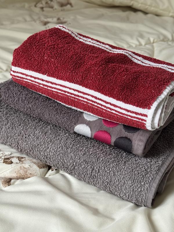 Набір м'яких та приємних на дотик рушників, в дуже хорошому стані, без плям та дефектів. 📌Розміри: Червоний рушник 95*47 см Сірий рушник горошковий принт 98*48 Сірий великий 131*70 см