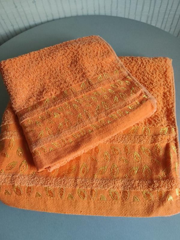 Два полотенца - банное и для лица красивого ярко оранжевого цвета с красивой вышивкой из шелка