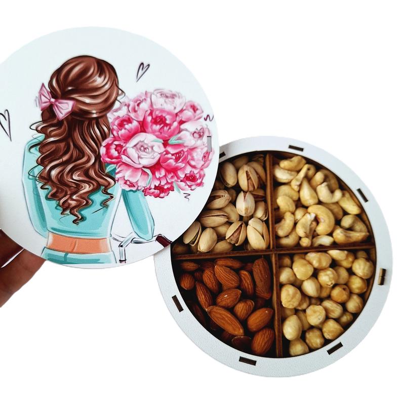 Деревянная коробочка с орешками диаметром 15 см. Такая коробочка прекрасно подойдет на подарок, к разным праздникам. Поделена на 4 отдела. Наполнение: - Фундук - Миндаль - Кешью - Фисташка Мы собираем орешки в коробочки под заказ, поэтому Вы можете быть уверены, что орехи будут всегда свежие и вкусные. Вес нетто - 300 граммов