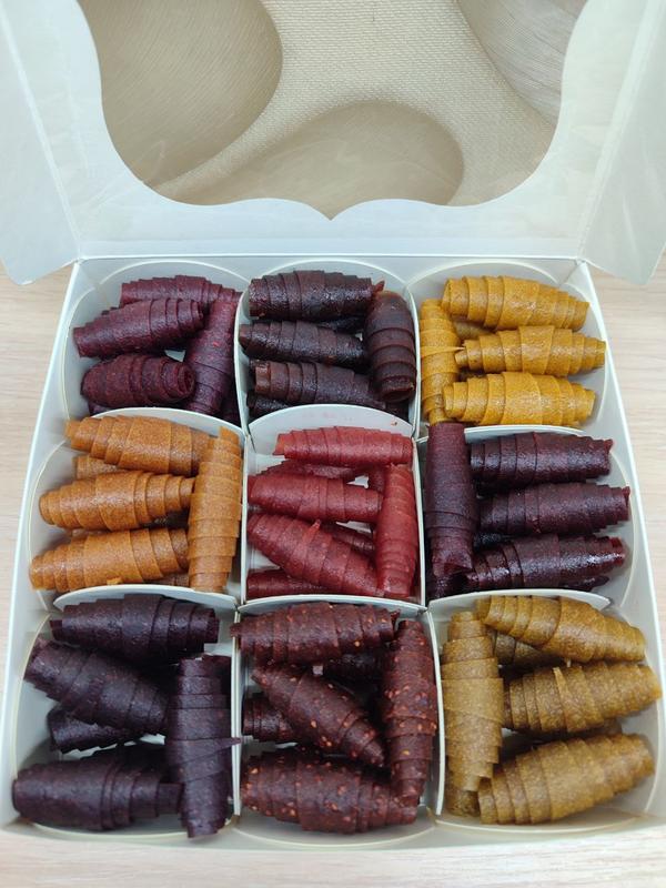 Натуральна пастила – це 100% фруктовий, смачний і корисний перекус для дорослих і дітей. - без доданого цукру, - без ароматизаторів - без барвників. Висушені листи з яблучного та фруктового або ягідного пюре, скручені в невеликі цукерочки. Вага: 280г Подарунковий бокс на 9 смаків Смаки на ваш вибір: Ягідні: полуниця, вишня, малина, порічка, смородина, черешня, ожина, виноград, шовковиця Фруктові: яблуко, слива, груша, абрикос, алича, персик, айва, гарбуз, диня Тропічні: банан, апельсин, ківі, гранат, грейпфрут, лимон+імбир, манго, ананас, шпинат+м’ята.