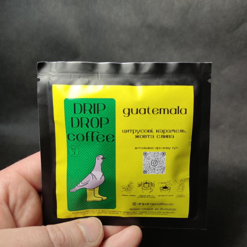Страна выращивания: Гватэмала. Сорт кофе: arabica specialty. Способ обработки зерна: мытый. Обжарка: светлая (фильтр). Профиль вкуса: Фундук, апельсин, тростниковый сахар. Бальная оценка: 85 Вес кофе в дрипе: 12 грамм. Уточняйте профиль вкуса. Периодически меняется регион/ферма выращивания. ___ Есть услуга фасовки под ваш логотип. Дизайн этикетки в подарок. Цена дрипа при фасовке под ваш логотип не меняется. Простые условия фасовки под ваш логотип: - кратно 30 штук одного вида зерна; - производство занимает от 1 до 3 будних дней; - разработка этикетки от 1 дня