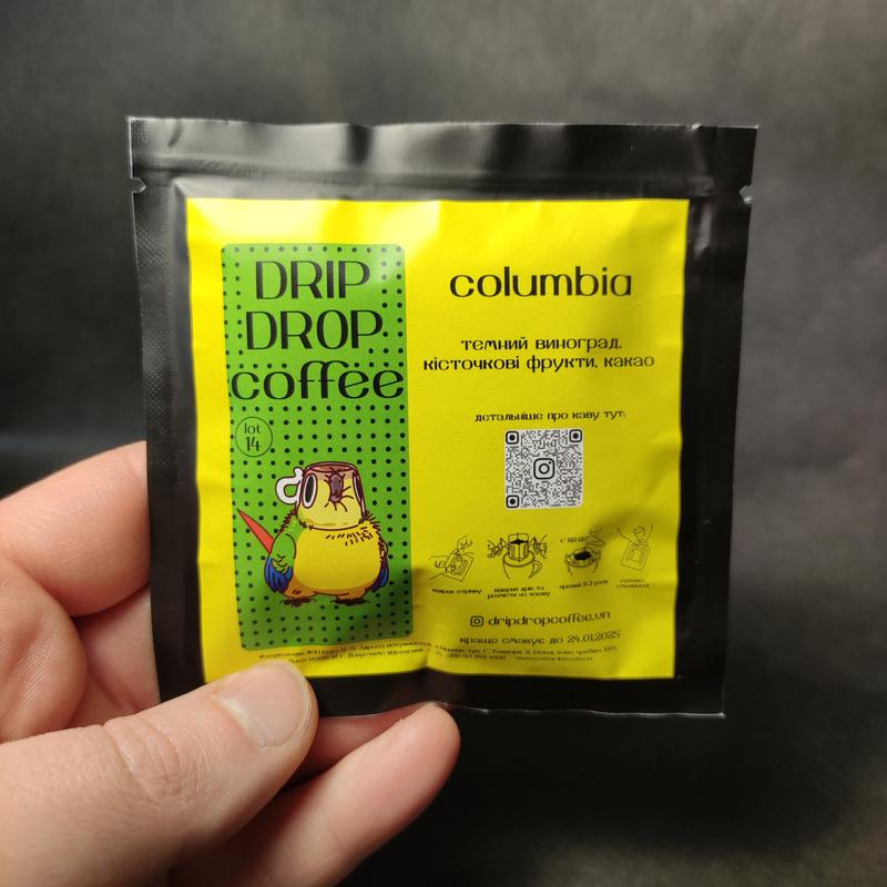 Країна вирощування: Колумбія. Сорт кави: arabica specialty. Спосіб обробки зерна: натуральний. Обсмаження: світле (фільтр). Профіль смаку: темний виноград, кісточкові фрукти, какао Бальна оцінка: 87 Вага кави в дріпі: 12 грамів. Уточнюйте смакові дискриптори. Періодично змінюється регіон/ферма вирощування ___ Є послуга фасування під ваш логотип. Дизайн етикетки в подарунок. Ціна дріпа при фасуванні під ваш логотип не змінюється. Прості умови фасування під ваш логотип: - кратно 30 штук одного виду зерна; - виробництво займає від 1 до 3 будніх днів; - розробка етикетки від 1 дня