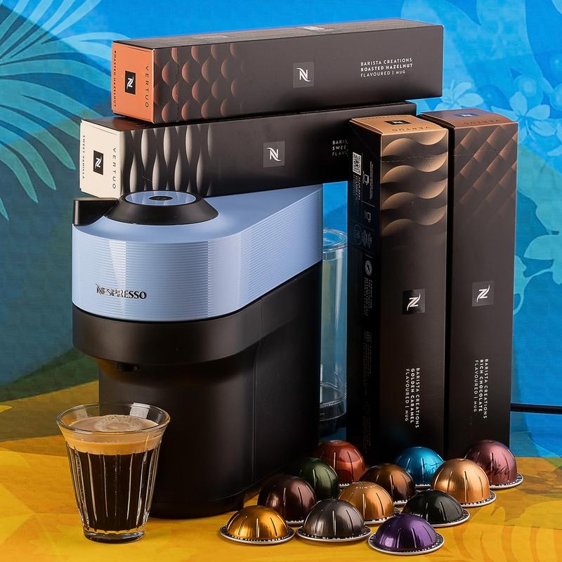 ## Набор Nespresso Vertuo Pop тихоокеанский синий + дегустационный набор + коллекция кофе Vertuo - идеально для подарка!!! Погрузитесь в мир изысканного вкуса и современного дизайна с эксклюзивным набором от Nespresso. Идеальный выбор для ценителей кофе, которые ценят как стиль, так и вкусовую глубину. В наборе: 1. Кофемашина Nespresso Vertuo Pop (тихоокеанский синий) + дегустационный набор (12 капсул): - Компактная, стильная и интуитивно простая в использовании - Технология центрифузионного заваривания для идеального вкуса каждой капсулы - Поддержка различных размеров чашек: Espresso, Double Espresso, Gran Lungo, Mug - Автоматическое распознавание капсул для безупречного результата - Энергоэффективная: автоматическое выключение после 2 минут простоя 2. Набор капсул с ароматизированным кофе Vertuo (4 вида) Самые популярные десертные вкусы для настоящего наслаждения: - Rich Chocolate - глубокий вкус темного шоколада с нотками какао (230 мл) - Sweet Vanilla - мягкий кофе с натуральным ароматом ванили (230 мл) - Golden Caramel - сбалансированная смесь с теплым карамельным послевкусием (230 мл) - Hazelnut - деликатный ореховый аромат с мягкой текстурой (230 мл) Преимущества набора: - Идеально подходит для подарка - Сочетание современной технологии и гастрономического удовольствия - Первый шаг в мир премиального кофе без лишних усилий ##