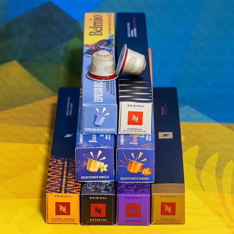 Для любителей кофе, которые предпочитают избегать кофеина, мы представляем серию сортов кофе без кофеина, которыми можно наслаждаться, не мешая спать по ночам. В этом наборе: - 1 туб (10шт.) Ristretto Italiano Decaffeinato - 1 туб (10шт.) Arpeggio Decaffeinato - 1 туб (10шт.) Volluto Decaffeinato - 1 туб (10шт.) Nespresso® капсулы Belmio Decaffeinato Caramel - 1 туб (10шт.) Nespresso® капсулы Belmio Espresso Decaffeinato - 1 туб (10шт.) Nespresso® капсулы Belmio Decaffeinato Vanilla - 1 туб (10шт.) Vienna Lungo Decaffeinato - 1 туб (10шт.) Vaniglia Decaffeinato (ваніль без кофеїну)