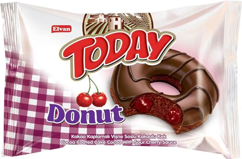 Бисквитный Пончик Today Donut с добавлением какао в шоколадной глазури с вишневым кремом. Прекрасное дополнение к чашке чая и хороший вариант сладкого перекуса. Компания Elvan - турецкий производитель сладостей с 1952 года, один из лидеров на рынке кондитерских изделий.