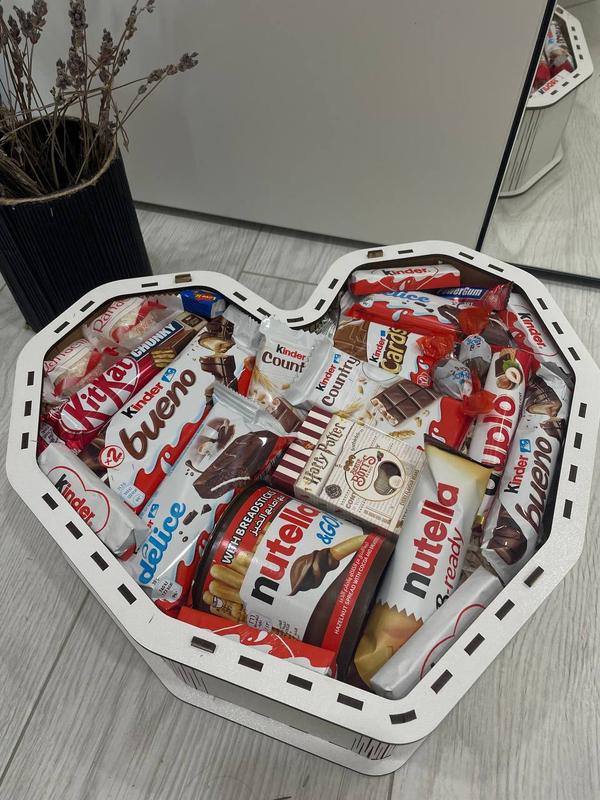Арт. 1010 Сердце киндер М Размеры: 33/29/10 В бокс 🎁 входить: 🎁деревянная коробочка в виде KINDER СЕРЦО ♥️ 🎁 открытка 🎁kinder bueno 🎁Nutella Go 🎁kinder bueno палочка 🎁kinder chocolate 5х 🎁kinder duplo 🎁kinder country 2x 🎁kinder cards 🎁kinder delice 2x 🎁raffaello 2x 🎁kit-kat 🎁PowerGum 🎁Nutella B-ready 🎁love is… 🎁Harry Potter 🎁kinder choko bons 2x 765 грн