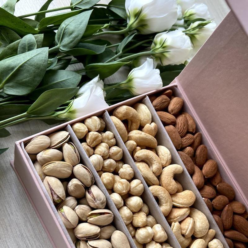 Коробочка на магните из четырех орешков: миндаль, кешью, фундук, фисташка суммарным весом 1200+ грамм. Размер коробочки 22х16х6 см, возможно брендирование при корпоративном заказе. В наличине расцветки, белый, бежевый, серый, розовый. Наполнение можно обсудить по вашему предпочтению =)