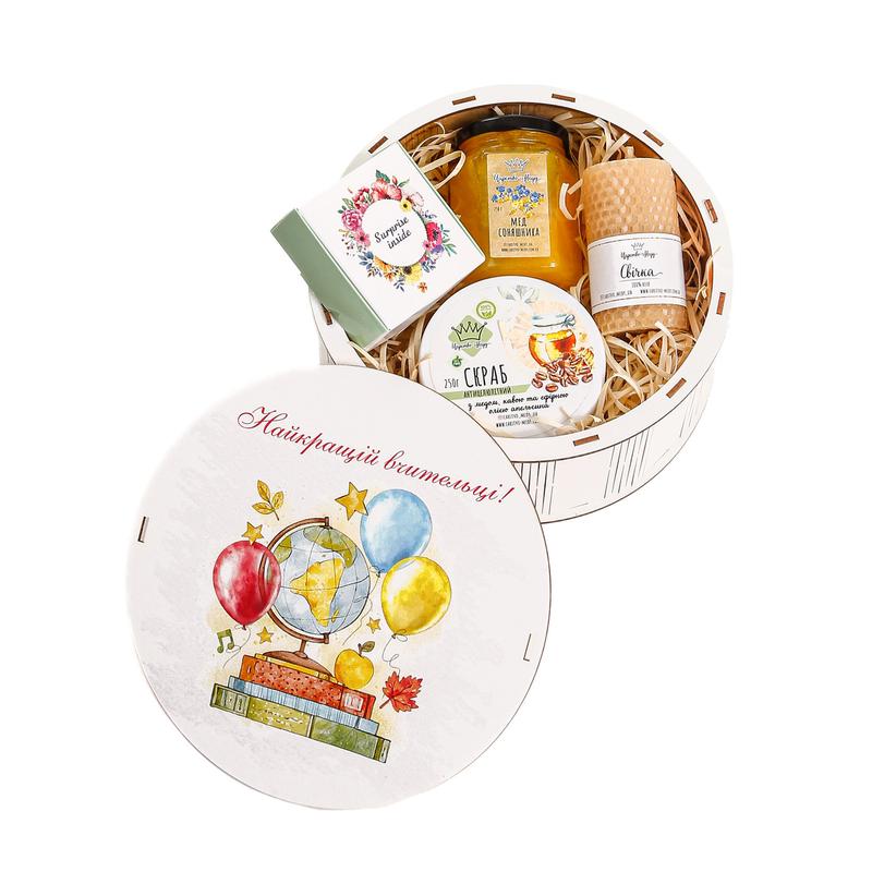 Подарочный набор №83. Круглый деревянный подарочный набор с надписью "Найкращій вчительці". Содержащий максимально концентрированный по своей пользе продукт. Это не только мед, но и натуральные полезные медовые продукты. Состав: - медовый скраб для тела - медовое мыло ручной работы - 8,5 см восковая свеча - 250 г мед подсолнечника Такой подарок прекрасно подойдет в качестве презента для классного руководителя, первой учительнице на такие праздники как Новый Год, 8 марта, День учителя, 1 сентября, День Рождения, День Знаний. Размер 21*21*7 см