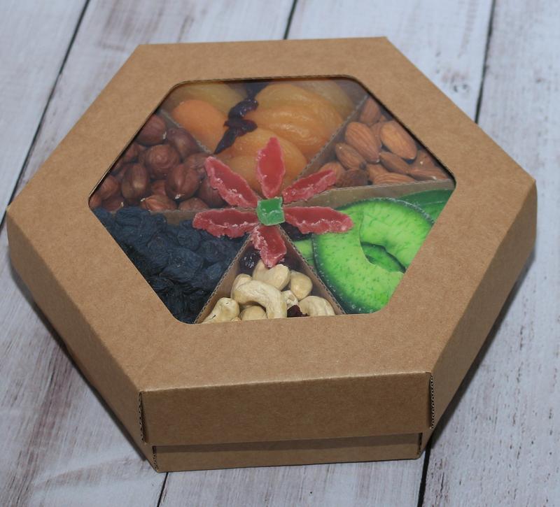 Подарунковий набір горіхів та сухофруктів чудовий та смачний подарунок для будь якого свята . Хрусткі горіхи та смачні сухофрукти завжди стануть доречними для святкового столу. Вміст даної коробки: Фундук, курага,мигдаль, помело, кеш'ю, ізюм синій без кісточок, журавлина папая. Коробки є в червоному, білому, чорному та крафтовому кольорі. Вага 800-900 грам Наповнення може бути різним за вашим смаком .