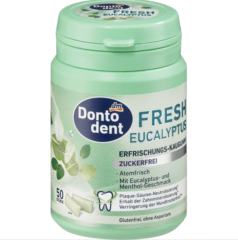 Жевательная резинка без сахара Со вкусом эвкалипта и ментола Безглютеновый и веганский Идеальный вариант для путешествий Вкусная жевательная резинка в версии со свежим эвкалиптом от Dontodent благодаря своему веганскому и безглютеновому рецепту является незаменимым спутником в повседневной жизни. Жевательная резинка не содержит сахара и аспартама и может помочь нейтрализовать кислоту в зубном налете.