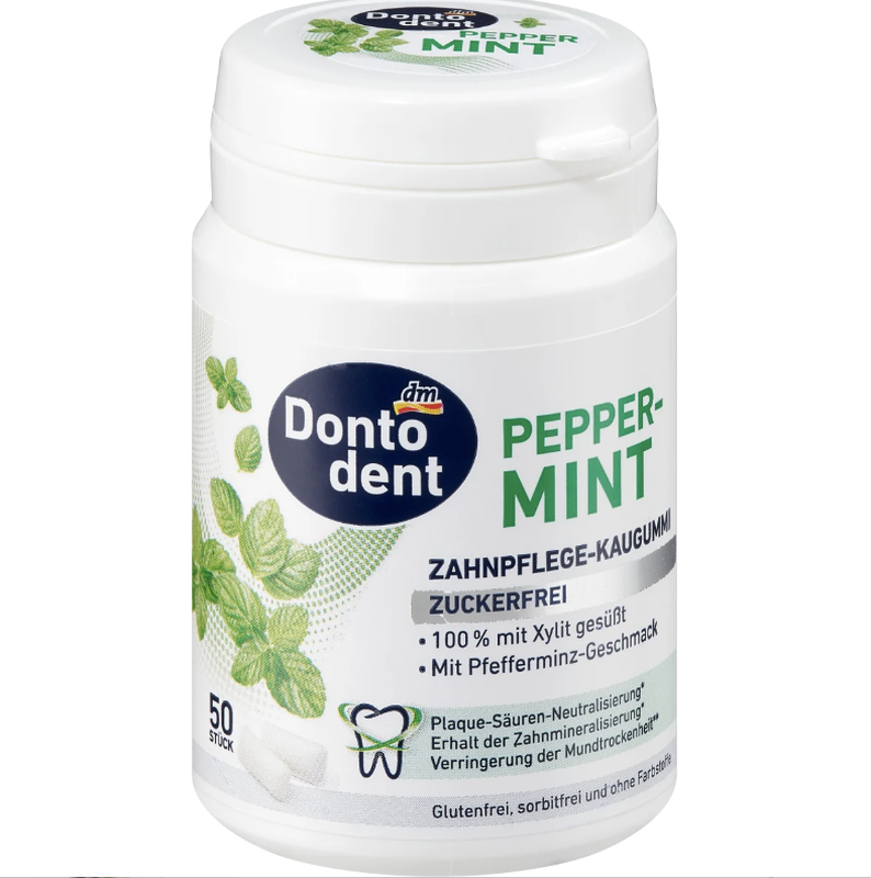Жувальна гумка Dental Care зі смаком м'яти 100% підсолоджений ксилітом Без цукру та без сорбіту Без глютену Без барвників Dontodent Peppermint - це високоякісна жувальна гумка для догляду за зубами, на 100% підсолоджена ксилітом і не містить цукру. Він також не містить сорбіту, глютену та барвників.