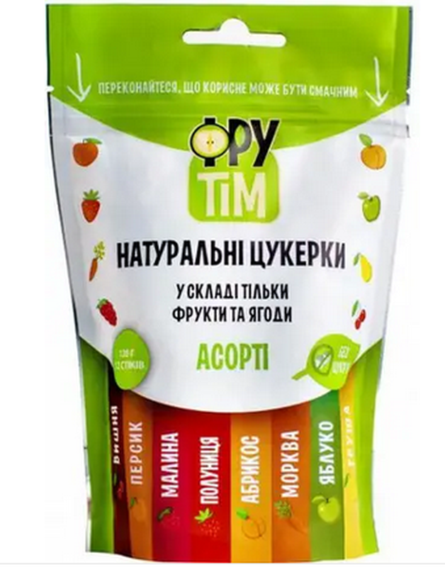Натуральные конфеты Фрутим – наслаждайся вкусом и использованием своих любимых фруктов в течение целого года! Взяв основу из самых вкусных яблок, мы объединили ее со сладким персиком и нежным абрикосом, аппетитной клубникой и сочной вишней, спелой малой и душистой грушей, а также более сладкой морковью. Именно так мы создали наши натуральные конфеты без какой-либо грамма сахара! С Фрутим - ты получаешь лишь сладость и пользу самих фруктов. Наша технология – это тщательный отбор фруктов и ягод высочайшего качества, и специальная термообработка, которая позволяет сохранить максимум витаминов и микроэлементов. Абсолютно никаких ПРАВИЛЬНЫХ ПОДСЛАСТЕЙ, КАСИТЕЛЕЙ и АРОМАТИЗАТОРОВ! Только натуральный вкус фруктов и ягод для тебя и всей семьи. Не содержит сахар, загустители, ароматизаторы, консерванты. Состав: яблоко, груша, вишня, персик, малый, клубника, абрикос, морковь. Энергетическая ценность 100 г продукта: 135 ккал. Пищевая ценность в 100 г продукта: жиры — 1 г., белки — 1 г., углеводы — 31.1 Производитель: ООО УКРЕКОДАР, Украина.