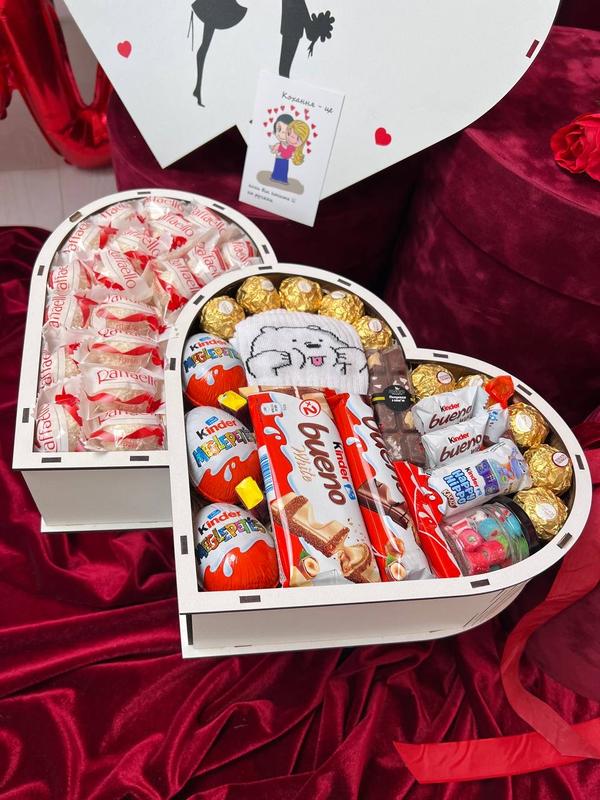 Арт. 1157 Двойное сердце💕 Размеры: 44/28/11 У бокс входить: 🤍деревʼяна коробка 🤍открытка 🤍raffaello -18x 🤍fererro rocher -10x 🤍шкарпетки 🤍kinder -3x 🤍kinder bueno 🤍kinder bueno палочка 🤍kinder chocolate 🤍kinder choko bons 🤍happy hippo 🤍kinder bueno mini 🤍love is… -2x 🤍натуральная карамель в баночке 🤍натуральный шоколад