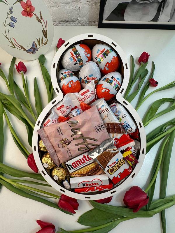 Арт: 179 8 марта 🌸 Размер бокса: 30см/30см/8,5см Состав подарок: ❤️ Деревянная коробочка в виде восьмерки ❤️ Цукерки RaffaelIo - 3 шт ❤️ Цукерки Ferrero Rocher - 3 шт ❤️ Kinder country - 1 шт ❤️ Kinder cards - 1 шт ❤️ Kinder Happy hippo - 1 шт ❤️ Цукерки Choko Bons - 1 шт ❤️ Kinder surprise - 5 шт ❤️ Kinder chocolate - 2 шт ❤️ Kinder bueno mini - 1 шт ❤️ Hanuta - 1 шт ❤️ Грессские орехи в молочные глазури Nutti - 1 шт ❤️ Love is.. - 2 шт ❤️ Открытка или топпер на выбор