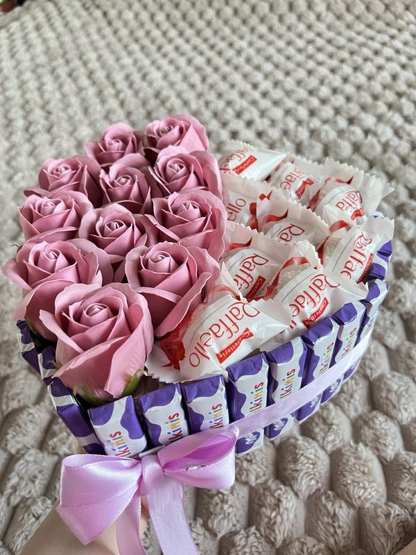 Продаю сладкий бокс, который сделала своими руками. В его состав входят конфеты «Milkinis”,”Raffaello” и мыльные розы. Цена 650 гривен.