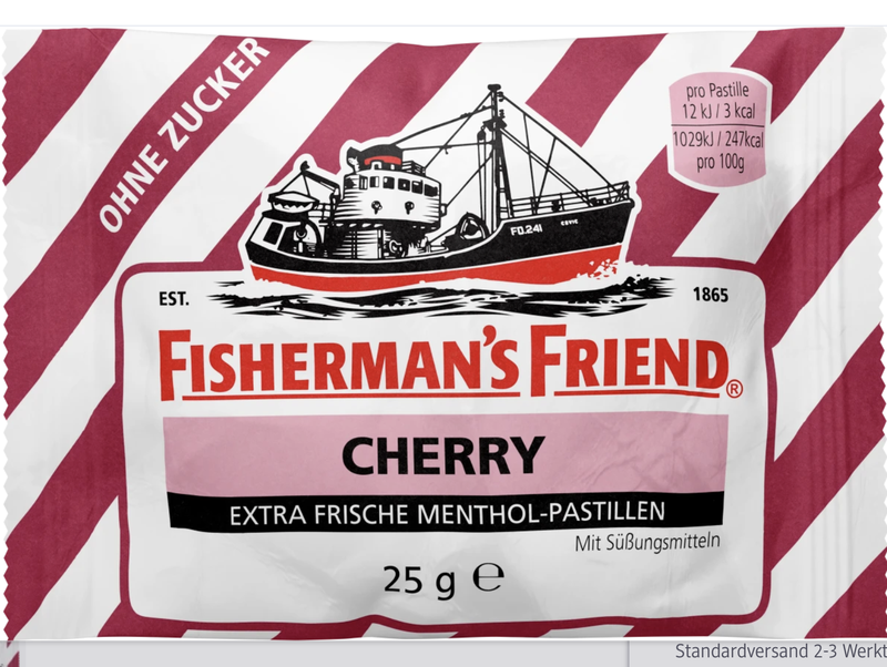 Fisherman's Friend — легендарные леденцы из Великобритании, созданные еще в 1865 году для рыбаков, которые работали в суровых условиях Северного моря для облегчения различных респираторных проблем, сегодня эти мощные ментоловые конфеты известны во всем мире. Маленькие, но очень сильные — у Fisherman's Friend есть богатый выбор вкусов: ментол, эвкалипт, лакрица, черника, вишня и другие. Без сахара, с натуральными ароматами – идеальный выбор для тех, кто ценит интенсивную свежесть и заботу о горле. Освежающий Сильный, как обычно Без сахара, искусственных красителей или ароматизаторов Обеспечить приятное дыхание Fisherman's Friend Cherry – очень свежие ментоловые пастилки с фруктовым свежим вишневым вкусом. Они освежают и вместе с тем избегают сахара.