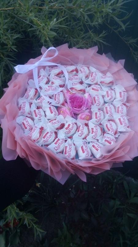ручная работа, букет из конфет рафаэлло Диаметр 30см(3 упаковки конфет) цветы из атласной ленты Упаковка букетная