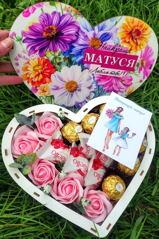 Бокс сердечко с конфетами. Хороший подарок для мамы Состав: конфеты Raffaello 6 шт конфеты Ferrero Rocher 7 шт мыльные розы 5 шт деревянный бокс сердечко Размер: высота 9 см ширина 23 см длина 20 см