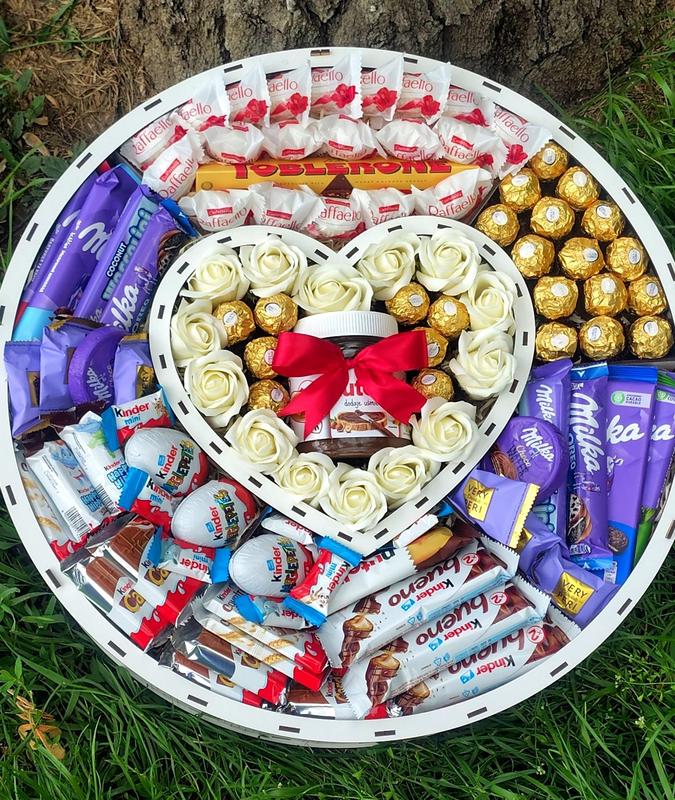 Поразительный бокс с конфетами. Огромный, красивый бокс для любимой девушки, мамы,сестры, барышни,девочки, подруги Состав: Милка шоколад 100 г*4 шт Милка вафля 4 шт Милка орео батончик 2 шт Милиум "Верри Перри" сахар 6 шт Таблерон шоколад 1 шт Рафаэлло 20 шт Фереро Роше 23 шт Нутелла 350 г Киндер сюрприз 3 шт Киндер кардс 5 шт Киндер буено 3 шт Киндер мини 7 шт Киндер хэппи хисо 2 шт Нутелла би реди батончик 1 шт Мыльные розы 15 шт Подарочная деревянная коробка Размер: высота: 12 см диаметр бокса 52 см