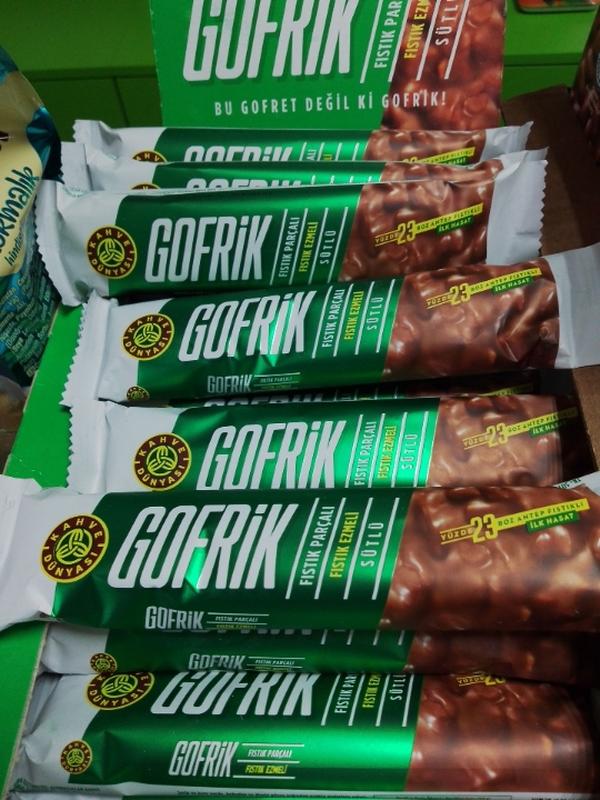 GOFRIK вафельные батончики. Они состоят из хрустящих вафельных слоев, наполненных фисташковым кремом и кусочками фисташки, и покрыты молочным шоколадом. Преимущество этого вафельного батончика в том, что фисташки содержатся не только в кремове и качестве присыпки, но и в качестве ингредиента в самой вафле. Мега фисташковый хрустящий вкус.