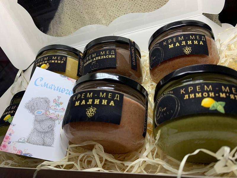 Набор крем-меда из шести вкусов по 100 мл. (вес 115 г.). Общий вес набора 690 г. Вкусы можно выбрать по Вашему желанию: кокос миндаль, мята-лимон, имбирь-лимон, какао-апельсин, какао-арахис, малина, ежевика, какао, апельсин, смородина, черника. Если Вы хотите порадовать родных вкусным, полезным и необычным подарком - то такой набор именно для Вас, ведь это способ сказать своим самым дорогим: "Я забочусь о тебе"