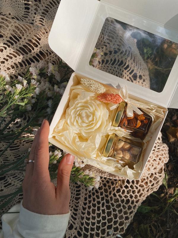 Солодкий подарунок до Дня вчителя, вихователю 🌼 Чудова альтернатива квітам, але наші квіти не зівʼянуть 🥰 Медовий набір 1: ❊ медова свічка півонія ❊ горішки в акацієвому меді по 55 г: фундук та мигдаль Відтінок півонії: молочний, жовтий, червоний Медовий набір 2: ❊ медова свічка жоржина ❊ горіхове асорті в акацієвому меді 100 мл: фундук, мигдаль, кешʼю Відтінок жоржини: молочний, жовтий, червоний та теракот