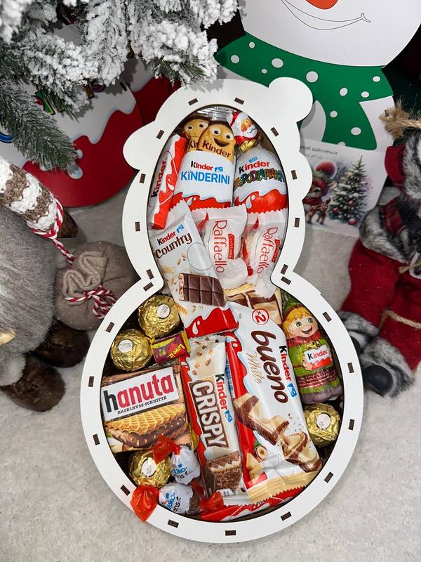 Арт: 208 Сніговичок ☃️ Розмір боксу: 35см/20см/9см Склад подарунку: 🎄Деревʼяна коробочка у вигляді сніговика 🎄 Цукерки RaffaelIo - 2 шт 🎄 Цукерки Ferrеro Rocher - 4 шт 🎄 Kinder bueno - 1 шт 🎄 Цукерки Choko-bons - 2 шт 🎄 Kinder surprise - 1 шт 🎄 Kinder country - 1 шт 🎄 Kinder chocolate - 1 шт 🎄 Kinder kinderini - 1 шт 🎄 Hanuta - 2 шт 🎄 Kinder crispy - 1 🎄 Шоколадна фігурка міні дід мороз - 🎄 Шоколадна фігурка kinder - 1 шт 🎄 Love is.. - 1 шт 🎄 Листівка або топер на вибір
