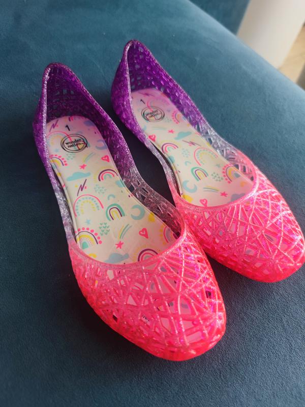 Силиконовые ажурные летние балетки с глиттером для девочки. Отличное качество, совершенно новые. Оригинальная расцветка переливается и блестит глиттером. Плоская подошва, мягкая стелька, очень легкие и мягкие. Удобные, эластичные, хорошо моются и не натирают ногу. Можно на пляж, бассейн и просто на ежедневную летнюю прогулку. Производство Китай. Размер: 33-34, стелька 21 см.