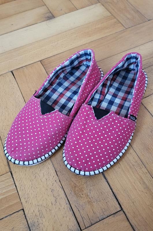 Идеальное состояние, носили в помещении, мягкая стелька, без свадьбы и отслаивания, очень удобные, легкие, текстиль снаружи и внутри, цвет розовый в мелкий горошек. Размер 32, стельки 20 - 20.5 см. Цена небольшая, разгружая шкаф.