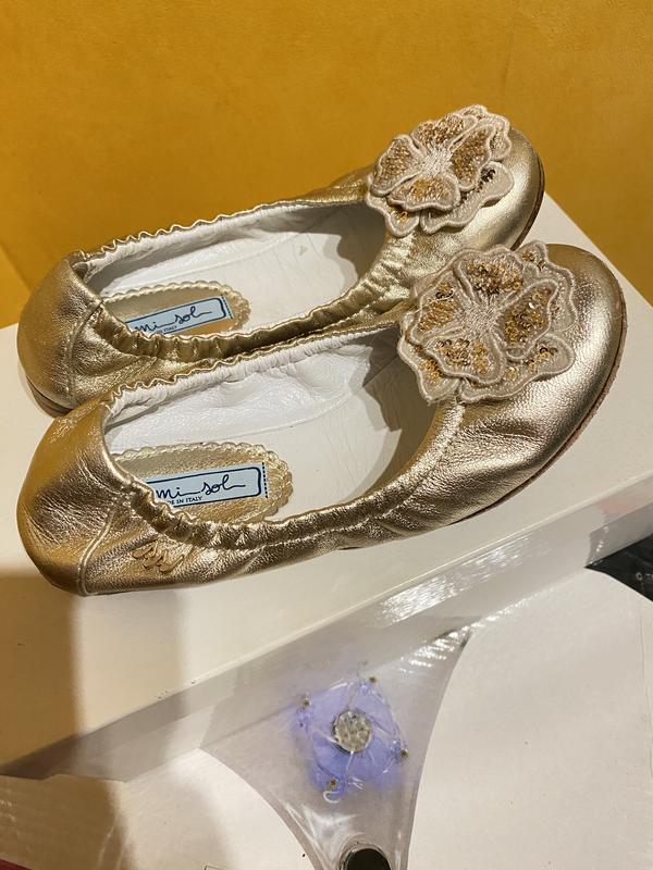 Балетки італійської фірми Il Gufo золотого кольору, шкіра всередині та зовні, підошва теж зі шкіри.Дуже мʼякі! Взувались кілька разів на свята.
