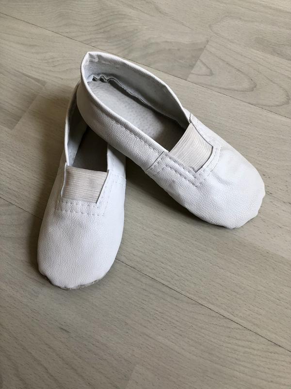 1. Бавовняні танцювальні балетки зручні для тренувань і виступів. П'ята і носок підшиті шкірою. Довжина по устілці 17 див. 2. Чешки шкіряні білі для танців і гімнастики на резинці. Матеріал верху - шкіра. Матеріал підошви - шкіра. Довжина по устілці - 18 см. Ціна за дві пари 150 грн