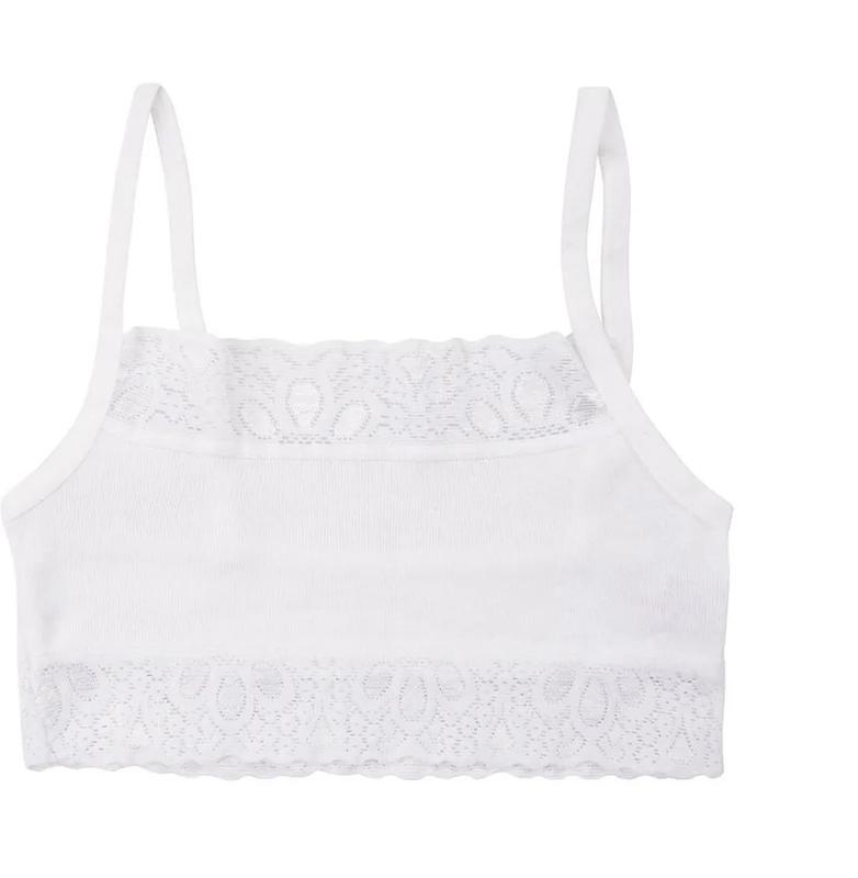 Опис Однотонний бюстик для дівчинки. Тонкі лямочки. Без чашок. Прикрашений мереживом. Розмір 8-9 років