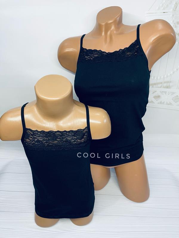 Однотонные черные маечки с кружевом ТМ Donella. 95% бавовна, 5% еластан. Доступные размер: 💥 4-5р. (110-116)-135 грн. Длина 43 см, пог 28 см. 💥 6-7р. (122-128)-150 грн. Длина 47 см, пог 30 см. 💥 8-9р. (134-140)-165 грн Длина 52 см, пог 32 см. 💥 10-11р. (146-152)-175 грн. Довжина 57 см, пог 36 см. Производитель Турция. Качество бомбеза👍🏼👍🏼👍🏼.