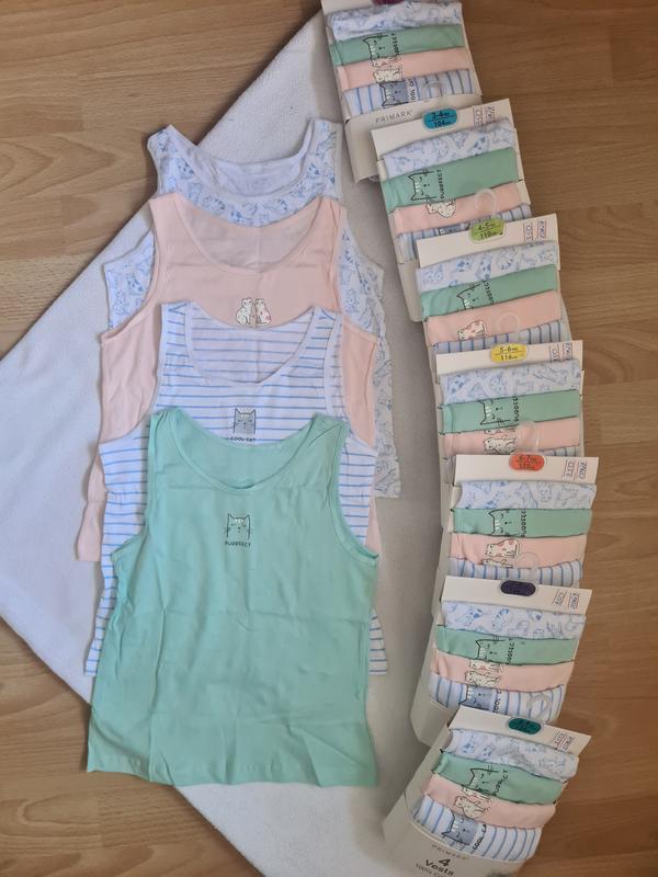 Майки фирмы Primark куплены в Испании фирменный магазин. Качественные и очень красивые Набор состоит из 4 шт Тканина 4×100% cotton Наличие размеров 1-2 р 86/92 3-4 р 98/104 5-6 р 110/116 6-7 р 116/122 8-9 р 128/134 На фото замеры размера 4-5 р Дополнительно фото и замеры в пп Отправка новая или укрошта Предоплата за доставку в две стороны или полная оплата Или заказ через сайт Нательная бельё не подлежит обмену и возврату.