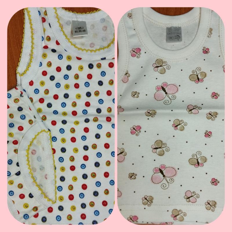 Трикотажные маечки Производитель Украина Размер 80 Фото 2 молочного цвета с бабочками цена 44 грн Фото 3 белого цвета с пуговицами +трусики цена 85грн