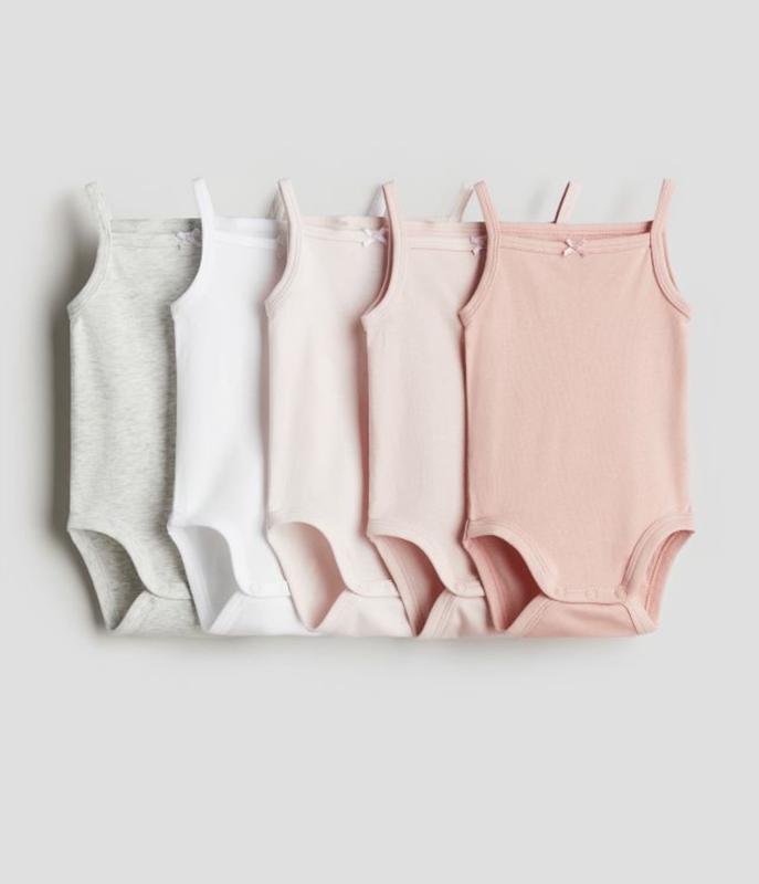 Боди без рукавов из мягкого хлопкового трикотажа. Запирается в промежности. Штук/пар: 5 Размер 98/2-3 года Длина рукава: без рукавов Декольте: круглый вырез Описание: светло-розовый/пудрово-розовый/светло-серый мергель/белый, твердый. Новые, купить можно как набором так и по 1