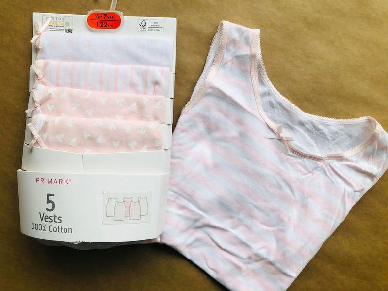 Primark оригинал Англия Комплект из четырех маечек Нежные, красивые цвета На обычных бретельках Комплект из 5 штук Размеры: 116 см (5-6 лет),146 см (10-11 лет), 158 см (12-13 лет)